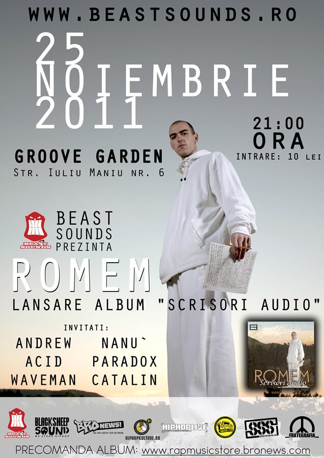ROMEM a anuntat data lansarii albumului „Scrisori Audio„. Aceasta va avea loc in data de 25 noiembrie 2011 in Groove Garden, Brasov, str. Iuliu Maniu nr. 6, incepand cu ora 21:00 si ii va avea ca invitati pe Andrew, Acid, Waveman, Nanu`, Paradox si Catalin, intrarea fiind 10 lei.