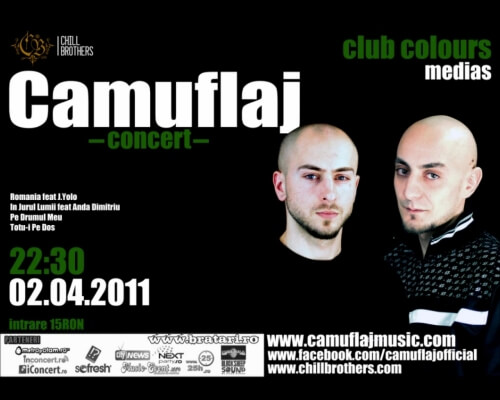 În Club Colours (Mediaş), pe data de 2 aprilie (sâmbătă), vor concerta baieţii de la Camuflaj! Intrarea se face după 22:30, iar preţul unui bilet este de 15 lei!