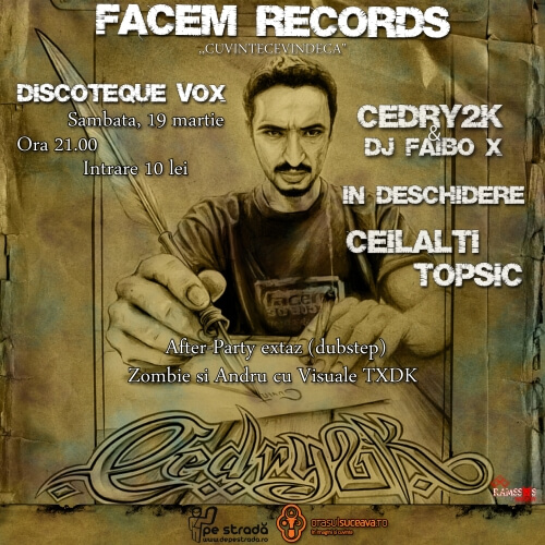 Cedry2k va susţine un concert sâmbată, pe 19 martie, in Discoteque Vox (Suceava). Intrarea după 21:00, preţul biletului 10 lei.