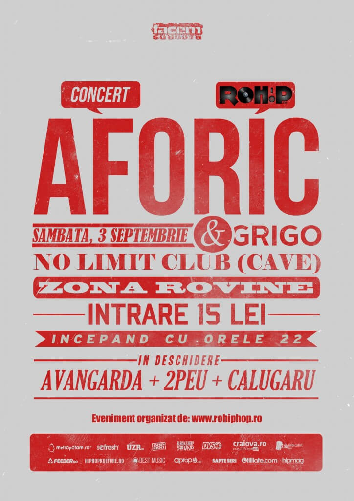 Echipa Rohiphop organizează încă un concert de data aceasta cu Aforic! Evenimentul are loc pe data de 3 septembrie(sâmbătă), de la ora 22:00, în No Limit Club (Zona Rovine) din Craiova, preţul unui bilet fiind de 15 lei. Alături de Aforic vine şi Grigo, iar în deschidere vor cânta Avangarda, 2peu şi Călugăru.