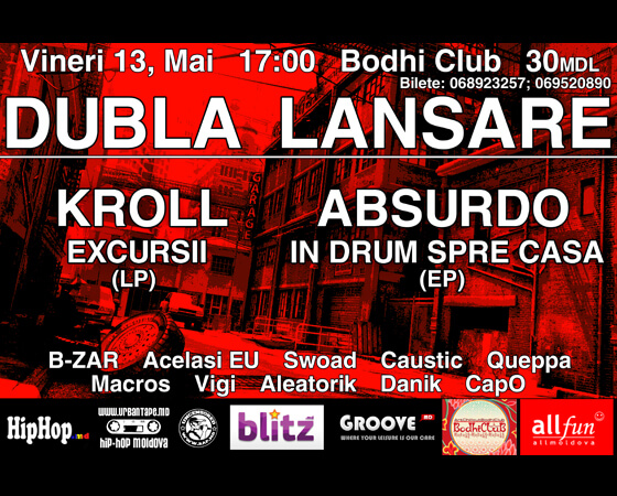 În Bodhi Club (Chişinău), pe data de 13 mai (vineri), va avea loc o dublă lansare! Kroll cu albumul său „Excursii” şi Absurdo „În drum spre casă”. Evenimentul începe de la ora 17:00, iar preţul unui bilet este de 30 MDL şi este limitat.