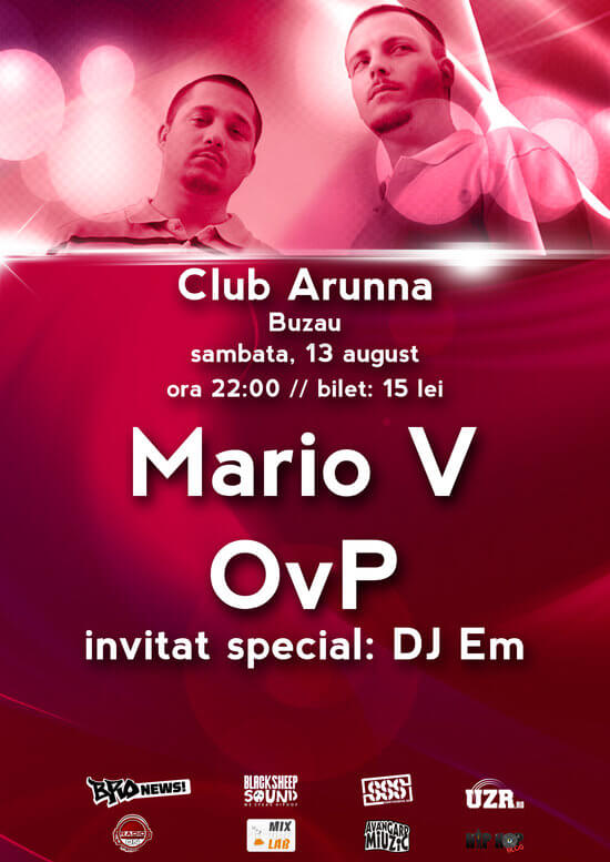Pe data de 13 august(Buzău), Mario V şi OvP vor concerta în Arunna Club din Buzău! Invitatul special va fi Dj Em. Evenimentul începe de la ora 22:00, iar preţul unui bilet este de 15 lei.
