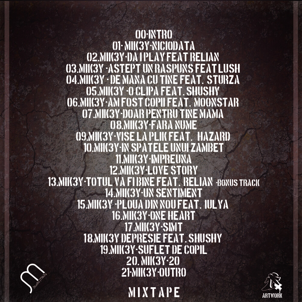 Mik3y ne oferă spre download gratuit mixtape-ul său intitulat „În spatele unui zambet”! Materialul conţine 21 de piese + colaborări cu Relian, Lush, Sturza, Shushy, Moonstar, Hazard şi Iulya. De mixaj şi masterizare s-a ocupat însuşi Mik3y, iar de cover s-a ocupat Wix.