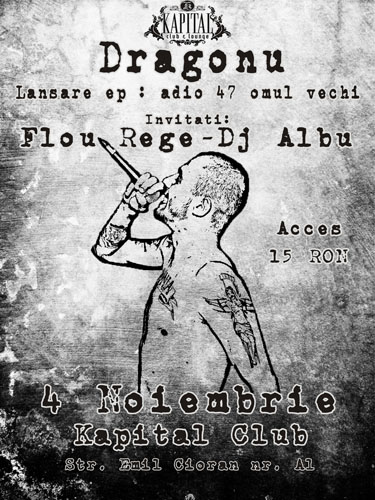 Marti, 4 noiembrie 2011, va invit in Club Kapital din Sibiu la lansarea primului EP – Adio 47 Omul Vechi. Invitati: Flou Rege, DJ Al*bu, Samurai si Junk Evenimentul va avea loc incepand cu ora 22, iar pretul biletului de intrare este 15 lei.