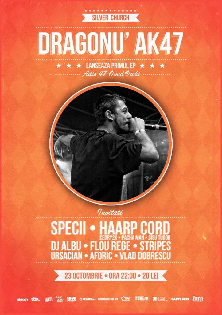 Dragonu’ îşi va lansa primul Ep intitulat „Adio 47 Omul Vechi” pe data de 23 octombrie(duminică), în Silver Church din Bucureşti! Alături de el vor veni şi Specii, Haarp Cord(Cedry2k, Sişu Tudor, Pacha Man), Dj Albu, Flou Rege, Stripes, Ursacian, Aforic şi Vlad Dobrescu! Concertul începe cu ora 22:00, intrare fiind 20 lei.