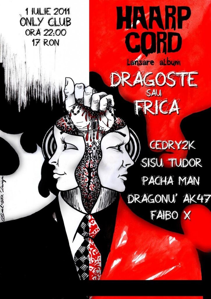 Haarp Cord, respectiv Cedry2k, Sişu Tudor, Pacha Man, Dragonu’ Ak47 şi Faibo X, va susţine un concert de lansare al noului album „Dragoste sau frică” pe data de 1 iulie (vineri) în Only Club din Arad. Evenimentul începe de la ora 22:00, preţul intrării fiind de 17 lei.