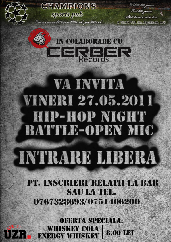 Champions Sports Pub în colaborare cu Cerber Records vă invită vineri, 27.05.2011 la Hip Hop Night.