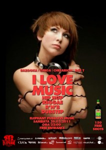 Pe 26 martie (sâmbătă) , va avea loc evenimentul ”I love music”. Totul se va petrece în Elephant Pub (Bucureşti), de la ora 22:00. Intrarea este liberă aşa că vă aşteptăm pe toţi acolo!