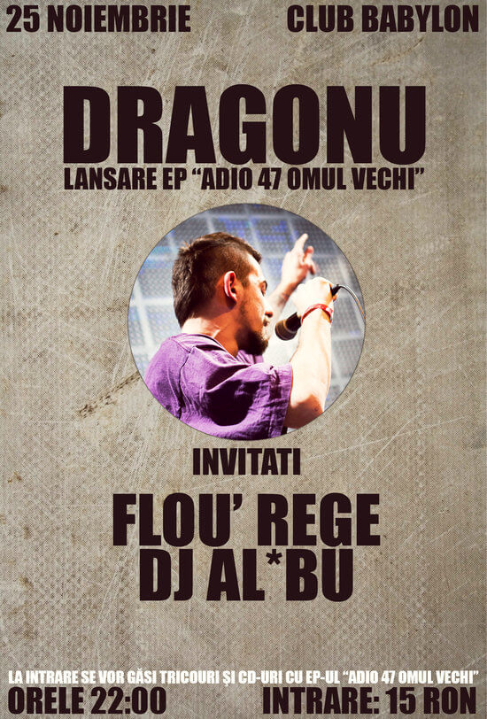 Dragonu’ își va lansa noul Ep „Adio 47 Omul Vechi” şi în Club Babylon din Suceava! Acesta va fi însoţit de Flou Rege și DJ Al*bu, urcând pe scenă de la ora 22:00. Evenimentul are loc pe data de 25 noiembrie(vineri), preţul intrării find de 15 lei. La intrare se vor găsi tricouri şi Cd-uri cu materialul „Adio 47 Omul Vechi„!