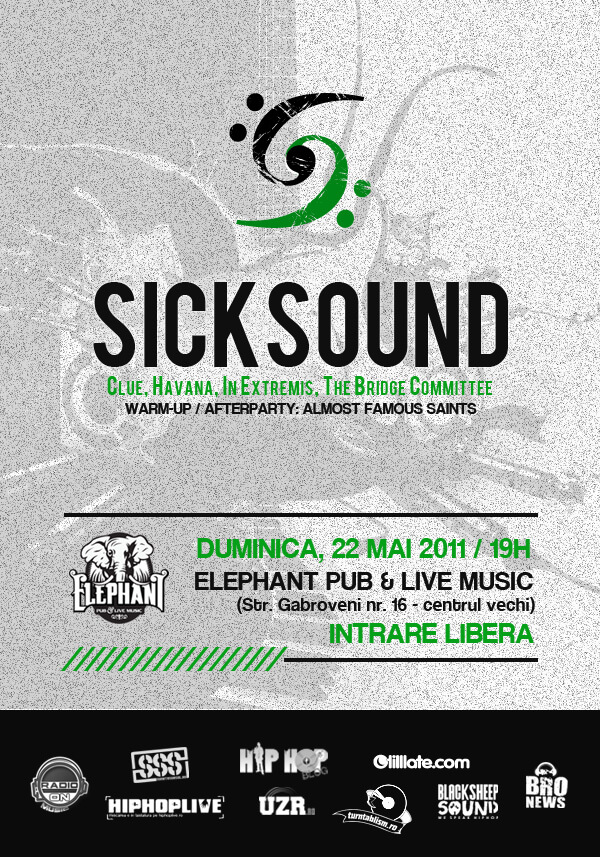 În Elephant Pub va avea loc un concert SickSound! Evenimentul are loc pe data de 22 mai (duminică), de la ora 19:00, iar intrarea este free. Ne vor încânta de asemenea Clue, Havana, In Extremis şi The Bridge Committee, iar cei de la Almost Famous Saints se vor ocupa de Warm-up şi Afterparty.