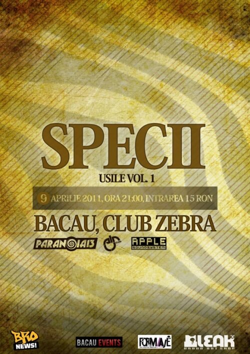 Băieţii de la Specii vor susţine un concert în Club Zebra (Bacău) pe 9 aprilie (sâmbătă). Evenimentul va începe după ora 21:00, iar intrarea costa 15 lei.