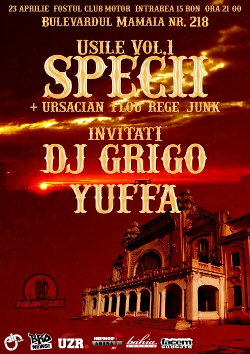 Băieţii de la Specii împreună cu Ursacian, Flou, Rege, Junk, Grigo şi Yuffa vor susţine un concert pe data de 23 aprilie (sâmbătă), în Fostul Club Motor (Constanţa). Evenimentul începe după ora 21:00, iar preţul este de 15 lei.