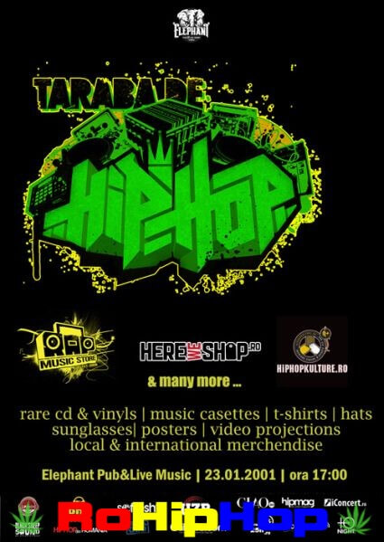 Duminica 23 ianuarie Elephantul se imbraca din nou in toale largi pentru o dupa-amiaza si o seara plina de surprize placute. Mai intai vine prima editie a TARABEI DE HIP HOP pe 2011, pentru cine nu stie despre ce este vorba ne autocitam: “Pentru unii casetele, cd-urile si vinilurile nu mai sunt la moda, pentru altii asta nu conteaza pentru ca sunt ceea ce se numeste colectionar. Pentru cei din urma o sa avem multe label-uri romanesti care isi vor prezenta si vinde produsele la acest targ la preturi promotionale … artistii vostri preferati va vor semna cd-urile … Veti putea gasi laolalta cd-uri, viniluri, tricouri si alte materiale promotionale pentru care in mod normal trebuia sa dati comanda pe net si sa asteptati cu saptamanile sa va ajunga acasa.